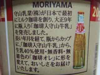 飲食 2011/06/09 守山乳業 元祖珈琲オレ 昭和レトロなパッケージの 守山乳業 元祖珈琲オレを購入です。 昭和レトロな絵柄に惹かれて購入した、 「守山乳業 元祖珈琲オレ」 ま、味は普通でしたが、レトロな雰囲気で満足。満足。 絵柄がレトロです。 大正9年湘南発祥と書かれています。 発売当時のボトルも。レトロですね~。 守山乳業が日本で初めてミルク珈琲を作ったとあります。 そうだったんだ。 雑学、雑学。 雰囲気だけで楽しめました! [0回]PR